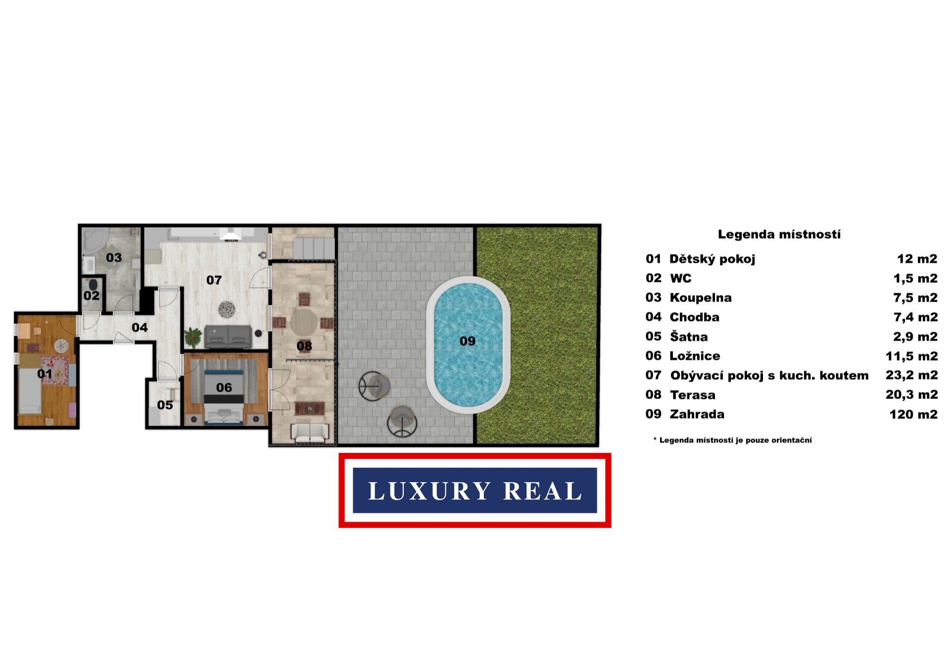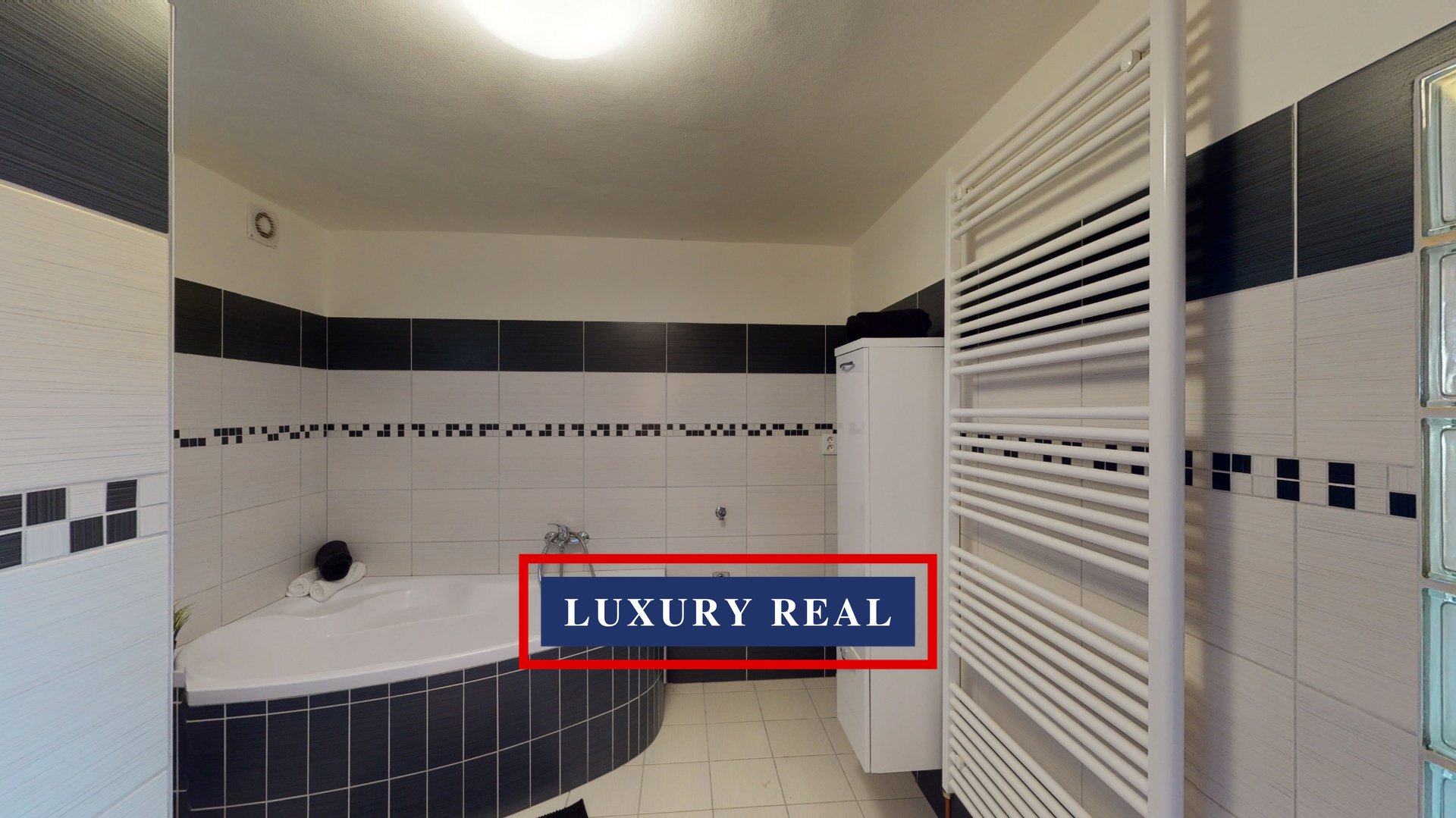 To, čím je byt unikátní, je terasa 24 m2 navazující na kuchyni a jeden z pokojů, rozlehlé podsklepení pod celým bytem a zahrada se zapuštěným bazénem o ploše 120 m2.