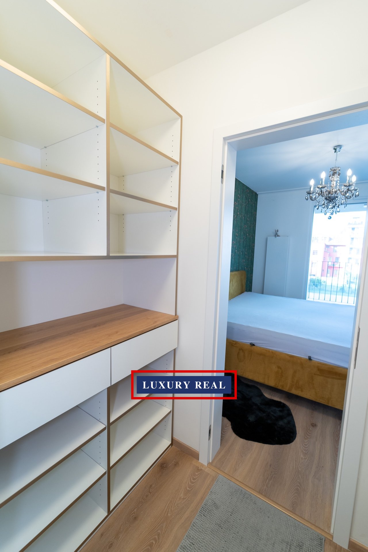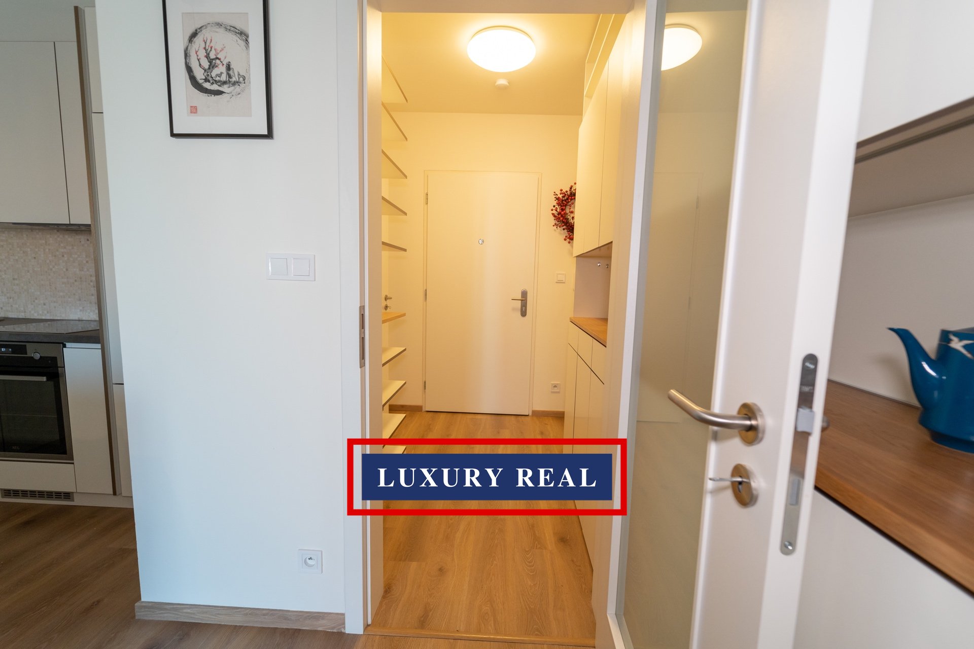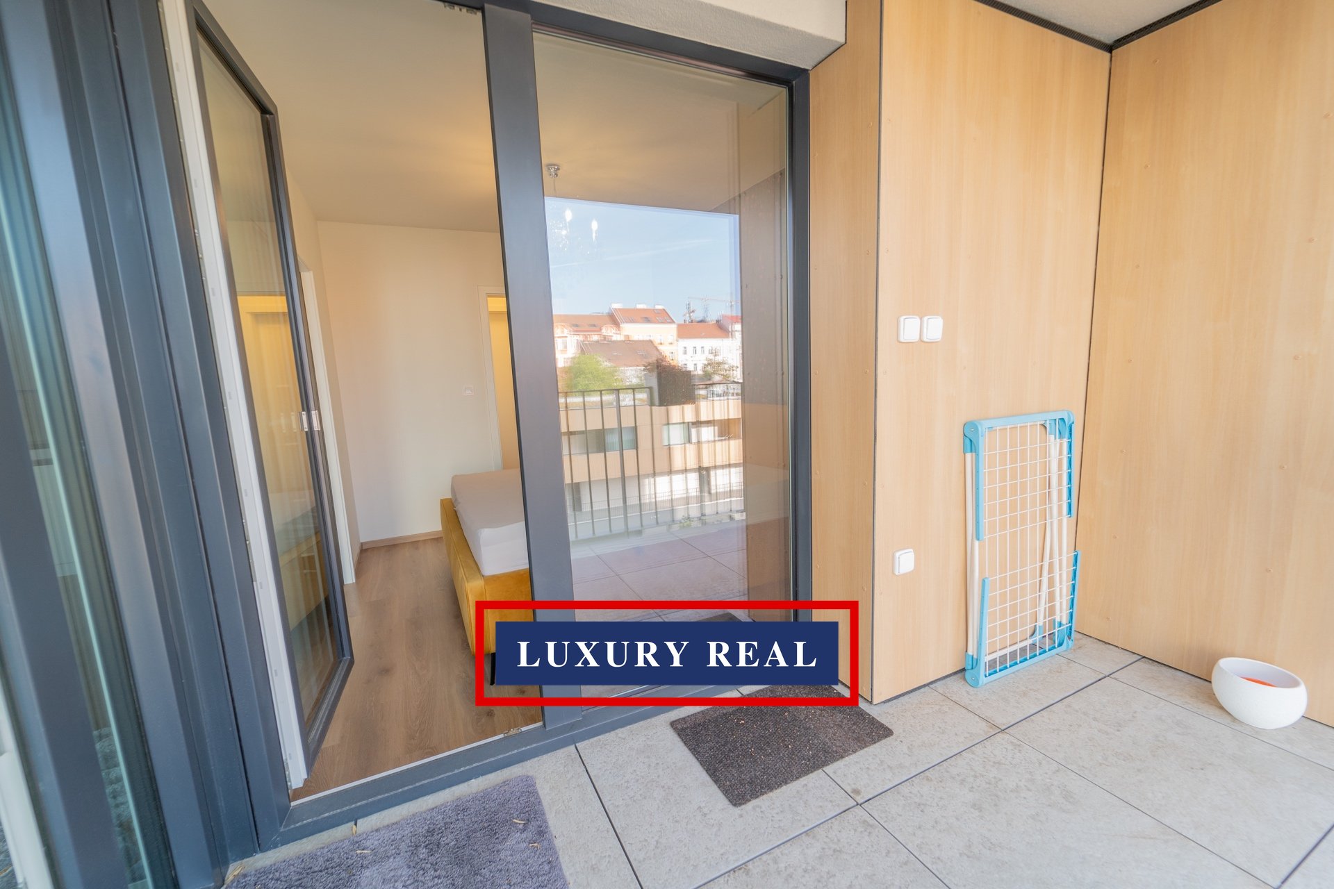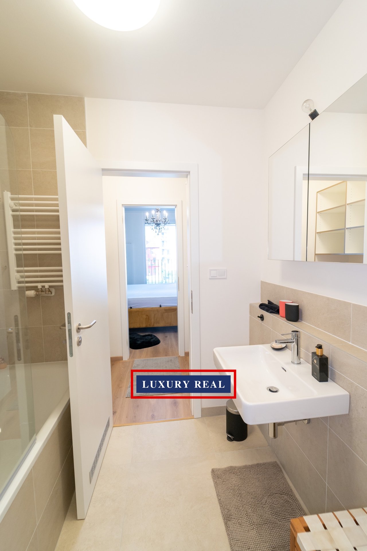 Byt je velmi prakticky dispozičně řešen a v každé své části poskytuje dostatek prostoru a světla. Je kompletně, luxusně a velmi vkusně vybaven. Obývací pokoj s navazující kuchyňskou linkou se spotřebiči AEG a LIEBHERR je průchozí jak z předsíně, tak z ložnice. Obývací část je pak zakončena podestou s prosklenou stěnou orientovanou do vnitrobloku. Z ložnice je vstup na balkon. Toaleta a koupelna s vanou jsou oddělené a přístupné jak z předsíně, tak také přes malou šatnu z ložnice. Nespornou výhodou je také komora, ve které je umístěna pračka se sušičkou BOSCH. Celý byt pak nabízí nepřeberné množství úložných prostor.
