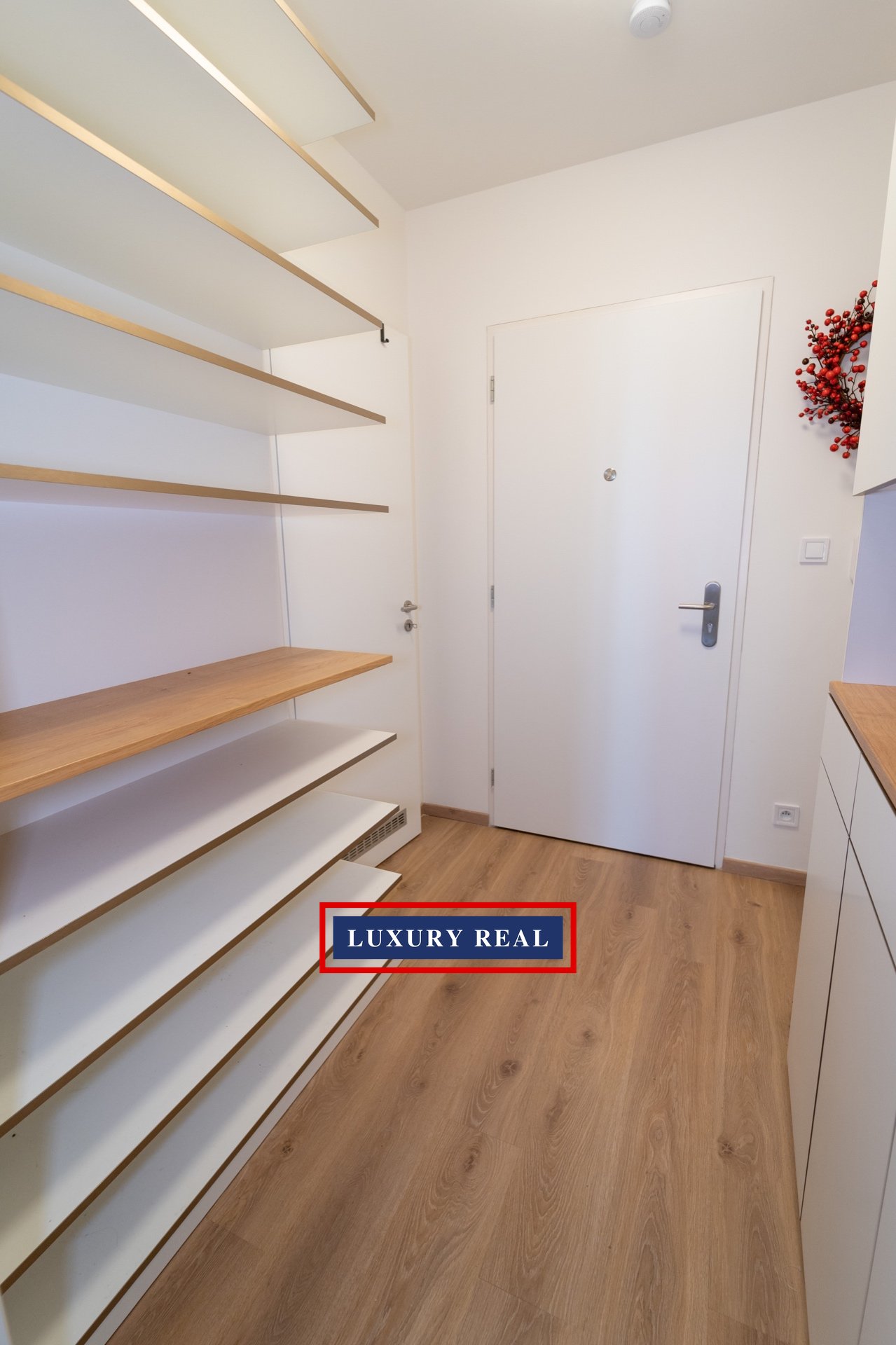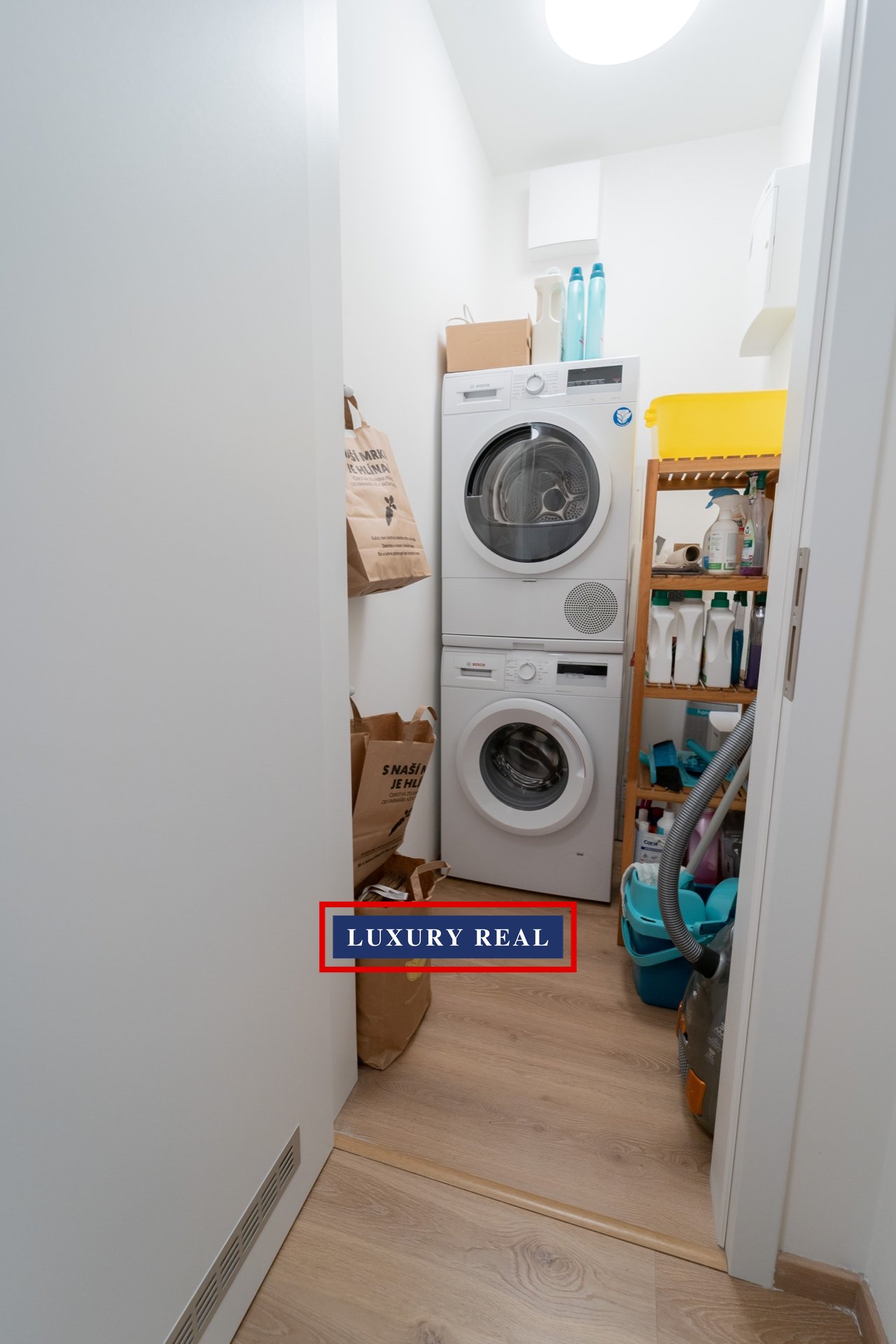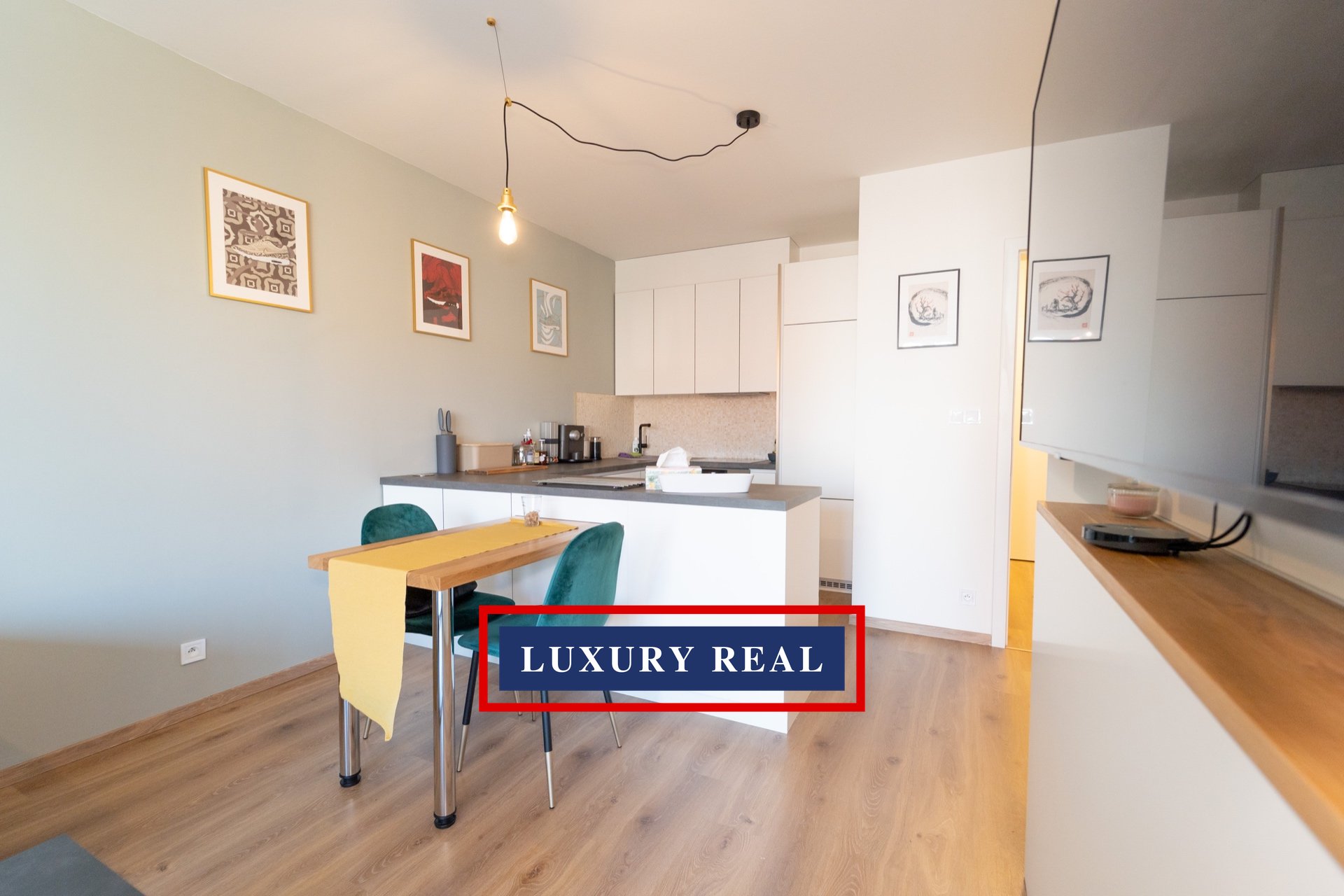 Byt je velmi prakticky dispozičně řešen a v každé své části poskytuje dostatek prostoru a světla. Je kompletně, luxusně a velmi vkusně vybaven. Obývací pokoj s navazující kuchyňskou linkou se spotřebiči AEG a LIEBHERR je průchozí jak z předsíně, tak z ložnice. Obývací část je pak zakončena podestou s prosklenou stěnou orientovanou do vnitrobloku. Z ložnice je vstup na balkon. Toaleta a koupelna s vanou jsou oddělené a přístupné jak z předsíně, tak také přes malou šatnu z ložnice. Nespornou výhodou je také komora, ve které je umístěna pračka se sušičkou BOSCH. Celý byt pak nabízí nepřeberné množství úložných prostor.