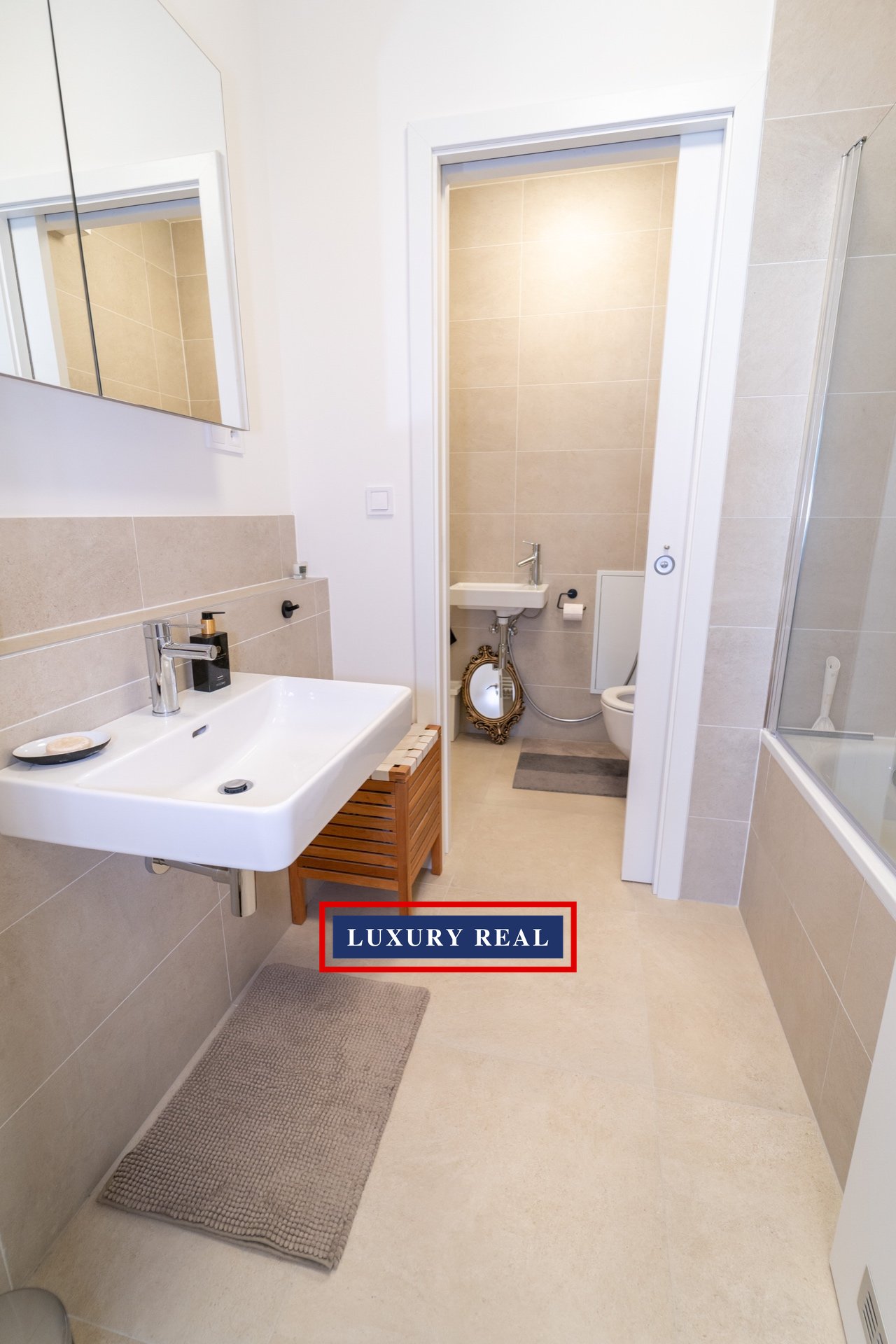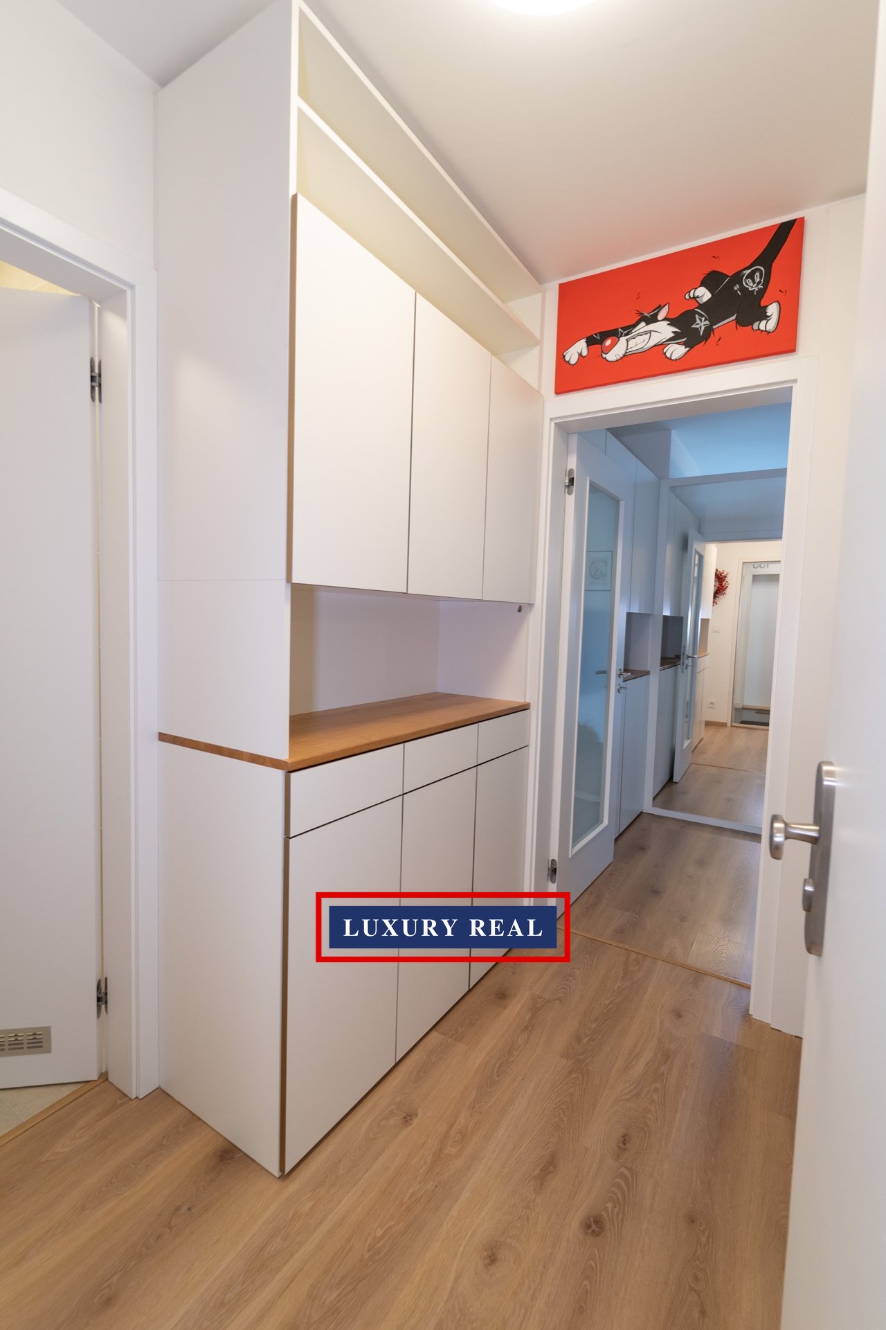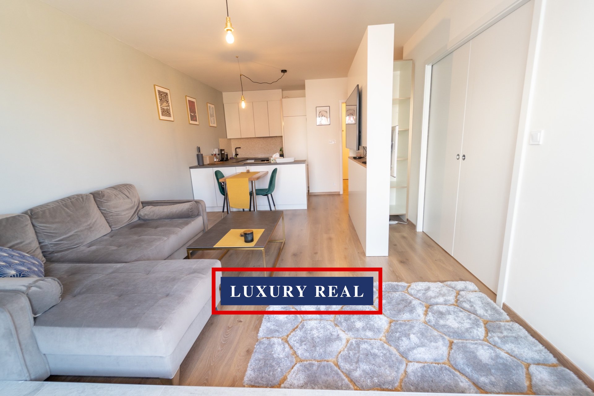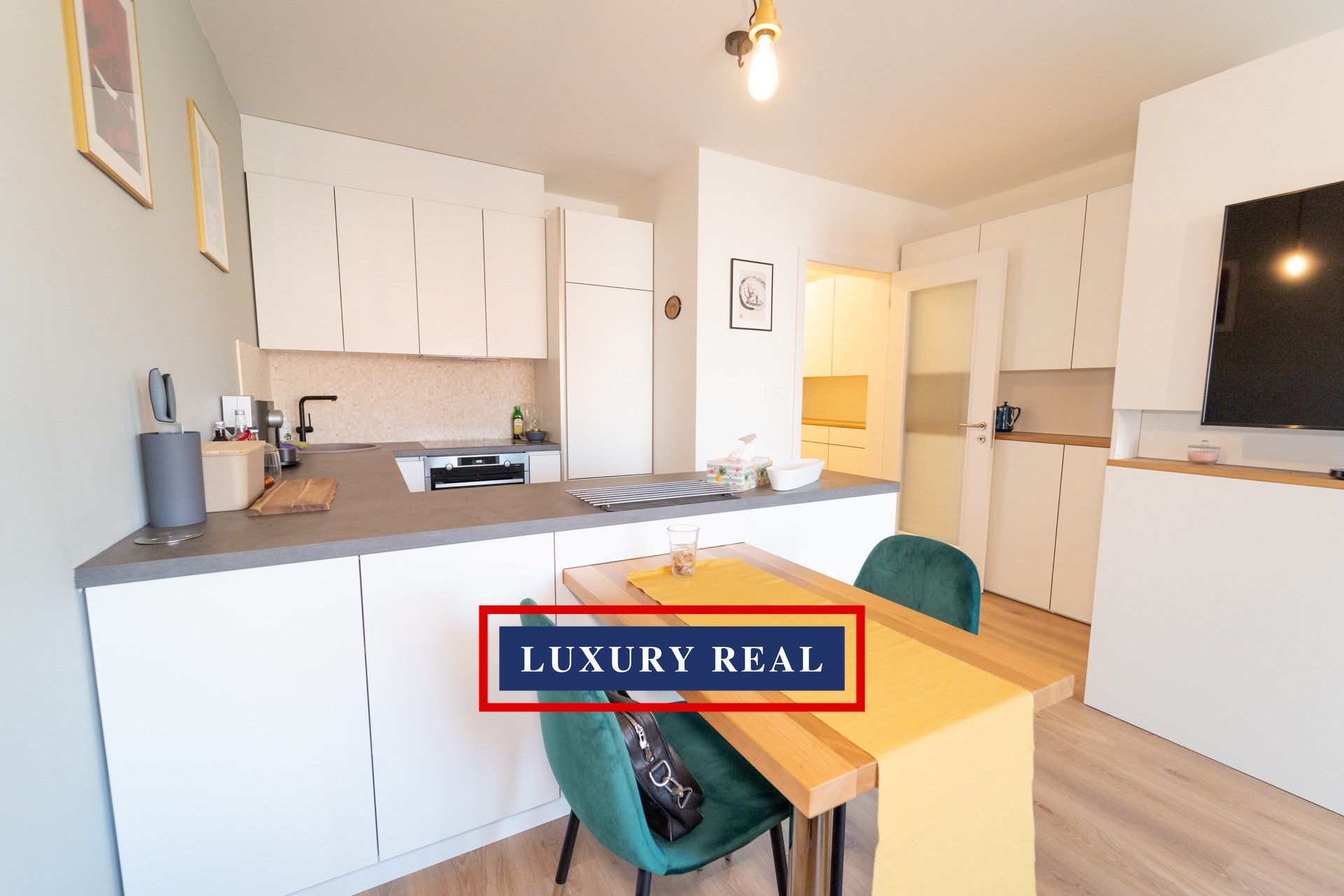 Byt je velmi prakticky dispozičně řešen a v každé své části poskytuje dostatek prostoru a světla. Je kompletně, luxusně a velmi vkusně vybaven. Obývací pokoj s navazující kuchyňskou linkou se spotřebiči AEG a LIEBHERR je průchozí jak z předsíně, tak z ložnice. Obývací část je pak zakončena podestou s prosklenou stěnou orientovanou do vnitrobloku. Z ložnice je vstup na balkon. Toaleta a koupelna s vanou jsou oddělené a přístupné jak z předsíně, tak také přes malou šatnu z ložnice. Nespornou výhodou je také komora, ve které je umístěna pračka se sušičkou BOSCH. Celý byt pak nabízí nepřeberné množství úložných prostor.